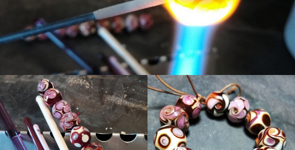 Glass rods are introduced to the flame and gently melted till they are of a honey like consistency and glowing orange. The glass is then wrapped, twisted, melted and manipulated to create amazing designs. With a wide variety of glass colours available to use now, there are endless possibilities of Designs that can be made, from bold coloured patterned beads to suitable patterns from the metal reactions and even forming the glass into animal shapes.